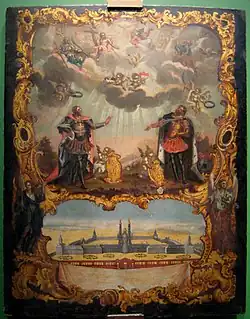 Icon, mid 18th century. Alexander Nevsky and his elder brother Feodor looking over the Alexander Nevsky Monastery. The Feodorovskaya Church was dedicated to Feodor.