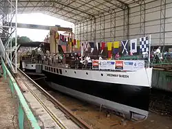 The Medway Queen fell into a state of severe dilapidation, but was bought in September 1977 by a trio of Kent businessmen for £10,000.[27] When they tried to move her out of the marina, she sank just outside in the River Medina. There she remained until 1984, when she was refloated and taken to Chatham in Kent.[28] After many years of uncertainty, she is now owned by the Medway Queen Preservation Society and is currently undergoing full restoration at Gillingham Pier.