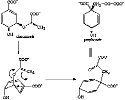 A proposed mechanism for chorismate mutase. Clark, T., Stewart, J.D. and Ganem, B. Transition-state analogue inhibitors of chlorismate mutase. Tetrahedron 46 (1990) 731–748. © IUBMB 2001