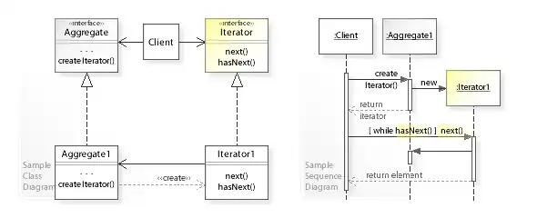 In the above UML class diagram, the Client class refers (1) to the Aggregate interface for creating an Iterator object (createIterator()) and (2) to the Iterator interface for traversing an Aggregate object (next(),hasNext()).