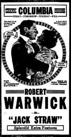 Jack Straw is a 1920 American silent comedy film produced by Famous Players–Lasky and distributed by Paramount Pictures. William C. deMille directed the film and Robert Warwick and Carroll McComas star. The film is based on a 1908 stage play by W. Somerset Maugham starring John Drew and a young Mary Boland. In 1926 Paramount attempted a remake of this film called The Waiter from the Ritz which was begun and/or completed but never released. James Cruze directed and Raymond Griffith starred; this film, if completed, is now lost. The 1920 film survives at the Library of Congress.[1][2][3]
