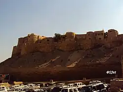 The fort's massive yellow sandstone walls are a tawny lion colour during the day, fading to honey-gold as the sun sets, thereby camouflaging the fort in the yellow desert. For this reason it is also known as the Swarn Durg, Sonar Quila or Golden Fort.[3] The name Sonar Kella (Bengali for Golden Fortress) was popularized by tourists after famous Bengali film of the same name, that was shot in this fort by eminent filmmaker Satyajit Ray. The fort stands amidst the sandy expanse of the great Thar Desert on Trikuta Hill, hence also known as Trikutgarh. It is today located along the southern edge of the city that bears its name; its dominant hilltop location making the sprawling towers of its fortifications visible for many miles around.[4]