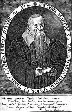 He matriculated (enrolled) at the University of Wittenberg on 21 April 1587 and then, on 10 February 1590, switched to the recently established University of Helmstedt.[3] Here he pursued the study of philosophy under the direction of the Lutheran metaphysician and aristotelian, his namesake Cornelius Martini.[4][5] Returning to Wittenberg, in 1593 Jakob Martini acquired a Master's degree. Under Polykarp Leyser the Elder and Aegidius Hunnius he acquired growing insight into the study of Theology, and in 1597 he took a teaching position in Norden (north of Emden, and along the coast to the west of present-day Bremerhaven) which also came with a pastoral appointment.[3]