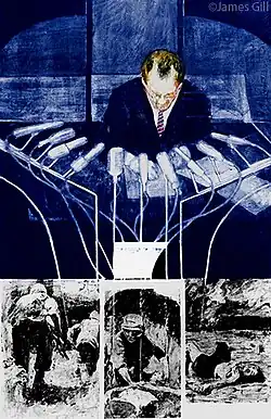 Arising out of a series of anti-war images is the work The Machines. The composition formally joins the media coverage of the United States with the combat conditions in Vietnam.[5]: 209  As a draftsman, Gill earned a reputation for handling contemporary issues through photographic images. The combination of his expressionist art and his graphite pencil went against the trend of this time. William Inge described the dark graphite pencil compositions as follows: "His paintings hold a moment of truth, which is of unfortunate beauty and makes memorable".[6] In this way, Gill goes even further than the often apolitical intent of the early movements of pop art. By addressing his paintings for example with the Vietnam War, his works gain an additional socio-critical dimension which provides a much wider range than the mere and superficially not intended criticism of pop art in consumer society.[7]
