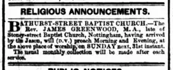 In 1875, Greenwood returned to Melbourne to preach at the Albert Street Baptist church[9] where his sermons were listened to with 'great attention'.[10]