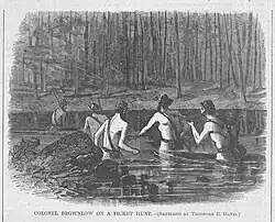 Colonel Brownlow on a Picket Hunt — Sketched by Theodore R. Davis (Harper's Weekly, August 13, 1864): Another illustration on this page represents Colonel Jim Brownlow with a small party of men in Georgia costume, crossing the Chattahoochee to capture the rebel pickets. The expedition was a successful one, but it broke up the friendly communication which had been for several days established between the pickets across the river. This was before SHERMAN had crossed. The morning after the occurrence notice was given of the changed situation by a Reb yelling out across the stream: "Hello, Yank!" "What do you want, Johnny?" "Can't talk to you'uns any more!" "How is that?" "Orders to dry up!" "What for, Johnny?" "Oh! Jim Brownlow, with his d-d Tennessee Yanks, swam over upon the left last night, and stormed our rifle-pits naked—captured sixty of our boys, and made 'em swim back with him. We 'uns have got to keep you'uns on your side of the river now."[51]