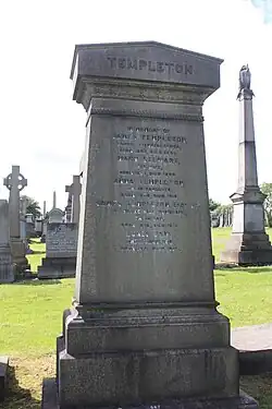 James Templeton died in 1885 and is buried in the upper part of Glasgow Necropolis. His wife Mary Stewart and son James lie with him.
