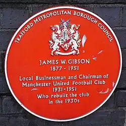 A plaque on Sir Matt Busby Way commemorating Gibson's work as chairman of Manchester United from 1931 to 1951