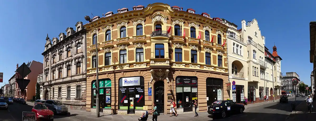 The wings of this corner tenement house draw attention towards the double architectural legacy of the Prussian partition and the period of the Polish People's Republic (PRL).[52] The edifice has been refurbished in the last quarter of 2018.[53]