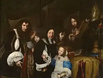 Jan de Herdt also was aware of trends in Central European painting. This is shown in his Portrait of the family of Imperial Goldsmith Franz Wilhelm de Harde von Antorff (Royal Museums of Fine Arts of Belgium). De Herdt's family portrait likely includes a self-portrait in the young man on the left who holds a watch in his left hand and points with his right hand to the floor. Alternatively, this may be a portrait of his nephew. Given the similarities between the two works, de Herdt's family portrait may indicate that he had seen the Family of precious stone cutter Dionysius Miseroni (National Gallery Prague) painted by the Czech portrait painter Karel Škréta in 1653. This was one of the first group portraits of this kind in Central Europe. In 1669 Tobias Pock painted a Self-Portrait with the artist's family in which he depicted himself in a manner that is almost identical to the one used by Jan de Herdt in his family portrait. Pock may have known de Herdt's family portrait. Jan de Herdt along with the above-mentioned artists created an entirely new visual language in Central Europe through this type of communicative group portrait.[8]