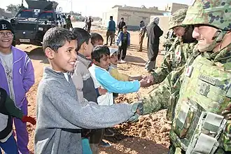 The Japanese Iraq Reconstruction and Support Group,[6][7] also known as the Japan Self-Defense Forces Iraq Reconstruction and Support Group (自衛隊イラク復興支援群; Jietai Iraku Fukkou Shiengun), was a battalion-sized, largely humanitarian contingent of the Japan Self-Defense Forces that was sent to Samawah, southern Iraq in early January 2004 and withdrawn by late July 2006. However, the last JASDF forces left Kuwait on December 18, 2008. Approximately 5,500 Japanese Ground Self-Defense Force members were present in Samawah between 2004 and 2006.[8]