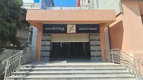 Jayadeva Hospital is a double-elevated interchange metro station on the north-south corridor of the Yellow Line and the Pink Line[1] of Namma Metro in Bengaluru, India. This metro station will be the first multi-elevated interchange station in the Namma Metro network. The station is named after the Sri Jayadeva Institute of Cardiovascular Sciences and Research which is located nearby and serves MICO Layout (BTM), Gurappanapalya, Jayanagar and JP Nagar 3rd Phase.