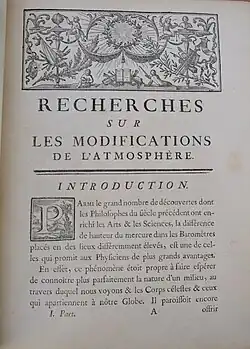 Introduction page of a 1772 copy of volumes 1 of "Recherches sur les modifications de l'atmosphère"