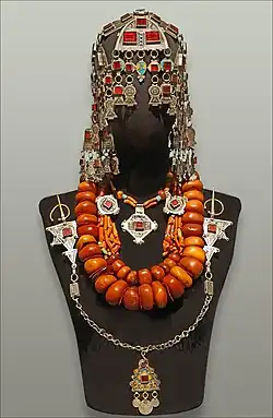 Jewellery of the Berber cultures (Tamazight language: iqchochne imagine, ⵉⵇⵇⵛⵓⵛⵏ ⵉⵎⴰⵣⵉⵖⵏ) is a historical style of traditional jewellery that was worn by women mainly in rural areas of the Maghreb region in North Africa and inhabited by Indigenous Berber people (in the Berber language Tamazight: Amazigh (sg.), Imazighen, pl). Following long social and cultural traditions, Berber or other silversmiths in Morocco, Algeria and neighbouring countries created intricate jewellery with distinct regional variations. In many towns and cities, there were Jewish silversmiths, who produced both jewellery in specific Berber styles as well as in other styles, adapting to changing techniques and artistic innovations.[1]