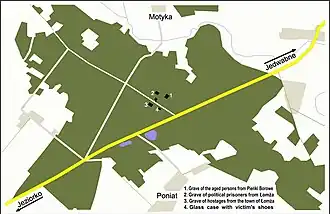Woodland cemetery in Jeziorko village in the Northeastern part of Poland is located approximately 7 kilometers (4.3 mi) from the town of Łomża along Route 668. The remains of victims murdered by the Nazi troops rest in the cemetery which is among very few with almost completely documented history of events that happened during the Nazi occupation.