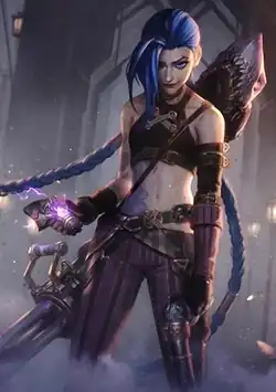 Jinx was added as a playable champion to the marksman roster of League of Legends in October 2013.[6] As established in the lore written by Graham McNeill, Jinx was once a young innocent girl from Zaun, the seedy underbelly of the utopian city of Piltover. She harbors a dark and mysterious past with Vi, another champion from the game.[3] Following a childhood tragedy, Jinx grew up to become "manic and impulsive" and her capacity for creating mayhem "became the stuff of legend". Her most notorious crimes include releasing a stampede of exotic animals, disrupting trade by lining the city's bridges with destructive explosives, and pulling a heist on one of Piltover's most secure treasuries.[3] The game's developers ensured the character moved quickly during gameplay to portray her chaotic personality and energy.[1]