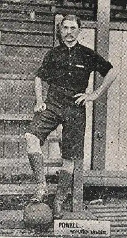 Born in Bristol in 1870,[2] Powell had joined the Army as a young man, and served for six years in the South Staffordshire Regiment.[3] He played football for the regimental team, and impressed enough in a match against the then Royal Arsenal in October 1892 that the club bought him out of the Army and signed him as a professional that December.[2] Having turned professional, Arsenal had been shunned by many other clubs and county associations, and only competed in FA Cup matches and friendlies. A strong and purposeful right back, Powell immediately became a regular in the Arsenal side.