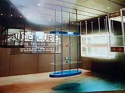 In 1994 he designed a new display case concept "Ice Cube Gliding Furniture System".[22] It's involves attachment to a ceiling of rails or fixed anchoring points. The rails are drawn steel profiles and are made in Austria. Electricity, sound systems (emergency) lighting systems an alarm systems are built into the ceilings.[23] The suspended display cases can be moved manually or by remote control. The light source itself is invisible and the system allows an object to be lit without its throwing a shadow.[24] Ice Cube won the "1998 Provincial Prize for Artistic Craft and Industrial Design" for the province of West Flanders.[25] The system is being applied in the Musical Instrument Museum in Brussels. Many of his works were shown at: