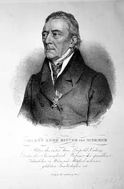 Scherer was born in Prague. He studied chemistry at the universities of Prague and Vienna, receiving his doctorate in 1782. As a student his instructors included botanists Joseph Gottfried Mikan and Nikolaus Joseph von Jacquin.[1] In 1797 he became a professor of chemistry at the Theresianum in Vienna, followed by a professorship at the Polytechnic Institute in Prague (from 1803). From 1807 to 1834 he was a professor of specialized natural history at the University of Vienna.[2]