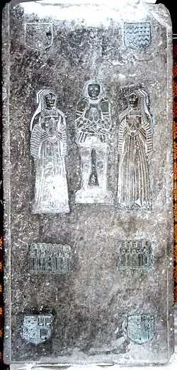 His chest tomb with monumental brasses on top, of himself between his two wives with his children below in two small groups exists in St. Mary's Church, Atherington, to where it was moved in 1818 from Umberleigh Chapel.[66] The Lisle Letters record some details concerning the making of the tomb. His widow Lady Lisle ordered "images & scripture...for Mt Basset's tomb" before she departed for Calais[67] to join her new husband, and a letter from Richard Kyrton to Lady Lisle dated 21 November 1533 states: "And as for your plates for the tomb, they are sent home by the carrier, and for the gilding they must descry all the arms by the reason of colours. And they asketh £ v for the doing of it and for the making Master George Rolles hath laid out xxxiii s iiii d unto Candlemas, the which Burye then must pay him".[68] In a letter dated April 1534[69] Sir John Bonde wrote to Lady Lisle "the pictures of Mr Basset's tomb" have been "laid on by the hands of Oliver Tomlyng". Thus the brasses were made in 1533 and set onto the tomb in 1534.[70] A letter to Lady Lisle from George Rolle[71] referred to an inscription on the tomb, which is now missing.