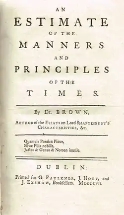 Brown's major popular success was the Estimate of the Manners and Principles of the Times (2 vols., 1757–1758), a bitter satire. It struck a chord after the Battle of Minorca (1756), a British reverse at the outset of the Seven Years' War.[1] Edmund Burke, in a review for The Annual Register for 1758, rejected Brown's analysis as far as it depended on charges of "effeminacy" in the British nation and aesthetic.[12] Thomas Sheridan believed the fundamental issue was selfishness, and the solution better oratory.[13]