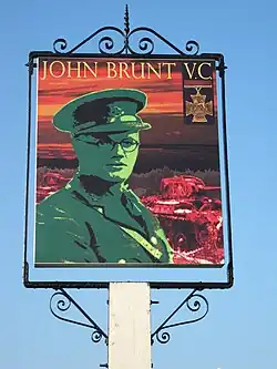 On 3 September 1947 the Kent Arms public house in Paddock Wood, Kent, was renamed the John Brunt V.C. in his honour. In 1997, the pub's name was changed to The Hopping Hooden Horse; after local outrage, the former name was restored in 2001.[2] Behind the pub, a small housing development called John Brunt VC Court was built.[8] The rose window at the west end of St Andrew's Church in Paddock Wood was designed by Joan Howson in memory of Brunt.[9]