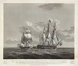 To travel to his new command Marshall took passage on board the 46-gun frigate HMS Java.[6] On 29 December Java encountered and was captured by the American 55-gun frigate USS Constitution after a battle of almost four hours. Marshall survived the battle and was detained with the rest of Java's crew. The senior surviving officer Lieutenant Henry Ducie Chads reported that despite being a passenger Marshall had provided support and advice throughout the battle and was slightly injured.[3][7] The Java survivors were sent home in a prisoner exchange from Brazil and a court martial investigating the loss of the frigate was held on 23 April 1813. Not being examined himself, Marshall provided testimonies that helped acquit the crew.[8] Having lost command of Procris because of his captivity, Marshall was given command of the 10-gun gun-brig HMS Shamrock, which he joined off Cuxhaven in the North Sea, on 11 November.[3][6] Marshall was given command of a squadron of gun boats, with which he sailed up the Elbe to Glückstadt, where he was to support the advance of a Swedish force towards the town.[3][6]