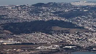 ![]() ![]() Aerial views of San Francisco from the southeast (2011) Top: McLaren Park is the forested area in the left-middle. Other landmarks include Bayview Park and Candlestick Park in the center foreground, Sutro Tower in the center background, and the Golden Gate Bridge in the right background. Bottom: Cropped to focus on McLaren Park | |