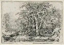 His etchings required a different technique from his watercolours: their delicacy and intricacy are said by the author Geoffrey Searle to resemble the work of John Crome.[11] In contrast to his watercolours, his etchings are mostly depictions of wooded landscapes, ranging in tone from those that are heavily inked, to others with a light, silvery touch and delicate lines. None of them depict human figures.[63] A set was published separately in 1852 as Nine Etchings by John Middleton, now held at the British Museum and Norwich Castle.[22][64] He also painted in oils, but little has been written of his oil paintings, whose subject matter was similar to his watercolours and which displayed a similar immediacy of execution.[29]
