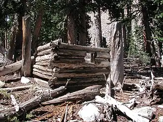 The district includes a mining adit and stope, an aerial tramway, four log structures, a log ore mill, a stable, trash dumps and a dam on Johnson Lake. Three cabins were built for accommodations, three small cabins for sleeping and storage, and a larger communal cabin. There is also evidence of tent platforms.[2] The site is well preserved, with some of the mining equipment intact. The aerial tramway transported ore from the mine 300 m (980 ft) across a steep slope to a terminal building, where the ore was packing in barrels and hauled by mule 1.1 km (0.68 mi) to the mill. The milled ore was then packed 1.8 mi (2.9 km) to the location of the present Shoshone Campground and further transferred 18 mi (29 km) to Garrison, Utah. From Garrison the ore went 75 mi (121 km) to the railroad at Frisco, Utah.[3]