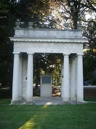 Johnston Green is a place where people get together, but it also holds some of the university's historical landmarks. Old Jeremiah, or the cannon as we know it today, was once situated on Johnston Green during the 1970s but has since been moved back to its original location, closer to the University Centre, where it sits today in the middle of Winegard Walk. Another landmark that sits on Johnston Green is The Portico.[14] The Portico has been around since 1874 when the first students walked through it as it was the door to the house of Frederick W. Stone.[14] Eventually the university purchased the building to use it as a lecture hall and a residence building. The building was torn down to make way for Johnston Hall, and The Portico was saved and moved onto Johnston Green as a commemorative item[14] Guelph alumni certainly enjoy the sentimentality of The Portico. This landmark is also a popular place for students to take their graduation photos.