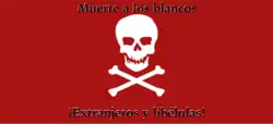 Digital reconstruction of Carrera's personal flag. The text translates to "Death to Whites, Foreigners and Liberals"[58]