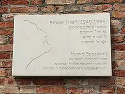 Brodsky died of a heart attack aged 55, at his apartment in Brooklyn Heights, a neighborhood of Brooklyn, a borough of New York City, on 28 January 1996.[12] He had open-heart surgery in 1979 and later two bypass operations, remaining in frail health following that time. He was buried in a non-Catholic section of the San Michele cemetery in Venice, Italy, also the resting place of Ezra Pound and Igor Stravinsky.[12] In 1997, a plaque was placed on his former house in St. Petersburg, with his portrait in relief and the words "In this house from 1940 to 1972 lived the great Russian poet, Iosif Aleksandrovich Brodsky".[31] Brodsky's close friend, the Nobel laureate Derek Walcott, memorialized him in his collection The Prodigal, in 2004.
