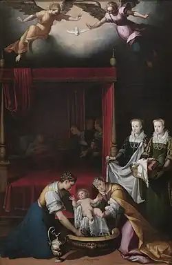 Juan Pantoja de la Cruz painted a great number of state portraits with the combined forces of his studio, his attendants, apprentices, and collaborators. He was primarily a portrait painter to the royal family, (whom he accompanied on journeys to Valladolid, Burgos, Lerma and the Escorial), and to the higher aristocracy. Pantoja also painted religious works primarily commissioned by the Spanish Queen, Margaret of Austria, wife of Philip III. Pantoja's paintings of religious themes also contain many portraits as auxiliary figures as in The Birth of the Blessed Virgin (1603) in which he included the mother of the Queen. He painted still lifes as well, but, like his ceiling frescoes, these have not survived. Pantoja returned with the court to Madrid and he died there on 26 October 1608.