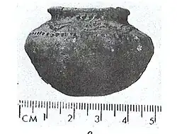 Eleven sherds representing a single vessel were present at Juntunen.[4] Ramey Incised is a Middle Mississippian pottery type first identified at the Cahokia Old Village site in southern Illinois. It has also been recovered at Carcajou Point in Wisconsin, but its presence at Juntunen marks the northernmost occurrence of any Middle Mississippian pottery type. Tempering is shell-tempered mixed with grit and decoration is a distinctive pattern of curvilinear designs. The vessel shape is thought to be a bowl with sharply defined shoulder. It was recovered in intermediate strata between the Bois Blanc and Juntunen Phases.[4][13]