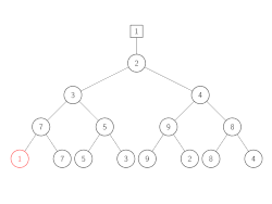 | 2 | Replaying the game 9 vs 7 (previous loser). 7 wins because it is smaller. Therefore, 7 is promoted to the top while 9 is saved in the node. |