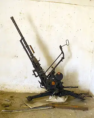 The KPV heavy machine gun (Russian: КПВ, romanizedKPV, an initialism for Крупнокалиберный пулемёт Владимирова, Krupnokaliberny pulemyot Vladimirova, 'Vladimirov's Large-Caliber Machine Gun') is a Soviet designed 14.5×114mm-caliber heavy machine gun, which first entered service as an infantry weapon in 1949. In the 1960s, the infantry version was taken out of production because it was too large and heavy. It was later redesigned for anti-aircraft use, as it showed excellent results as an AA gun against low flying aircraft, with a range of 3,000 m (9,800 ft) horizontally and 2,000 m (6,600 ft) vertically.[4] It was used in the ZPU series of anti-aircraft guns. Its size and power also made it a useful light anti-armour weapon on the BTR series of vehicles and the BRDM-2 scout car.