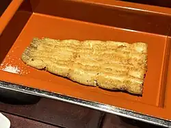 Kabayaki (蒲焼) is a preparation of fish, especially unagi eel,[1] where the fish is split down the back[2] (or belly), gutted and boned, butterflied, cut into square fillets, skewered, and dipped in a sweet soy sauce-based marinade before being cooked on a grill or griddle.