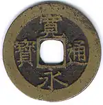 The Kan'ei Tsūhō (Kyūjitai: 寛永通寳; Shinjitai: 寛永通宝) was a Japanese mon coin in use from 1626 until 1868 during the Edo period. In 1636, the Kan'ei Tsūhō coin was introduced by the Tokugawa shogunate to standardise and maintain a sufficient supply of copper coinage, and it was the first government-minted copper coin in 700 years. The government adopted the coin after its successful introduction in the Mito domain ten years prior in 1626, the third year of the Kan'ei era. These coins would become the daily currency of the common people and would be used for small payments.[3][4][5]