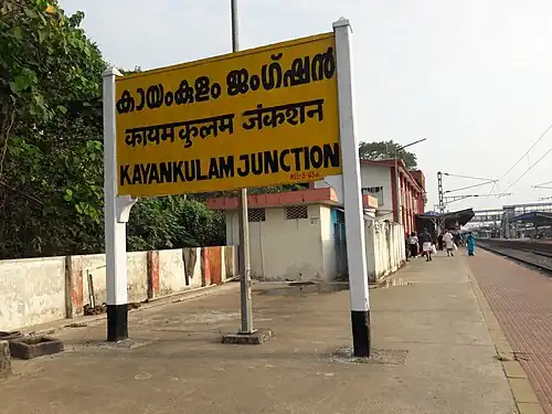 Kayamkulam Junction railway station (station code: KYJ[2]) is an NSG–3 category Indian railway station in Thiruvananthapuram railway division of Southern Railway zone.[2] It is a railway station in Kerala, located at Kayamkulam, Alappuzha district. It is an NSG 3 category station. It stands at the junction of three lines- south towards Thiruvananthapuram via Kollam, north towards Ernakulam via Alappuzha and north-east towards Ernakulam Junction/Ernakulam Town via Kottayam. The station is located 1.7 km (1.1 mi) from Kayamkulam town, near Kayamkulam–Punalur Road (KP road). In 2018, the rail wi-fi broad-band connection has been introduced in Kayamkulam.
