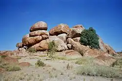 Kaytetye call the area around Barrow Creek Thangkenharenge which includes the site of their creation story at Elkerempelkere.[12][13] Traditionally, the Kaytetye people maintain their connection to the sacred sites like Elkerempelkere. The Devils Marbles, which the Kaytetye call Karlu Karlu, are located on a sacred Dreaming site. It has been desecrated by whites on occasion.[14] Granite was removed from the site for the tomb commemorating John Flynn, the 'Flying Doctor'. though subsequently restored under protest.[15]