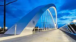 The city of Strasbourg lies opposite Kehl over the river Rhine and the two share some municipal services. Kehl station is located near the Europabrücke (Europe Bridge), which can be crossed on foot to enter Strasbourg. Bus line 21 used to connect Kehl with the nearest tram stations across the Rhine in Strasbourg, but Strasbourg tramway line D has since been extended to Kehl. It opened on April 28, 2017 to Kehl station, and to Kehl town centre in November 2018.[9][10]