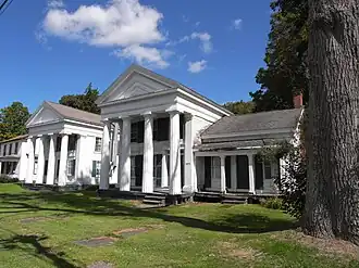 Kenyon Residences, also known as Twin Sisters, is a pair of historic home and located at Mt. Vision in Otsego County, New York. They are a pair of Greek Revival style 2-story, wood-frame dwellings. They both have temple form facades characterized by Doric order columns supporting over scaled, elaborately embellished pediments. The house at 62 Main St. was built between 1839 and 1851. The main block of the house at 60 Main St. was also built between 1839 and 1851, with a three-room, 1+12-story wing added about 1859. Also on the property is a shed.[2]