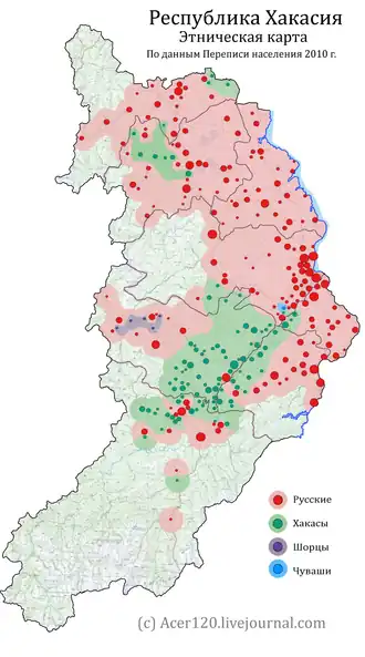 According to the 2021 Russian Census,[23] ethnic Russians make up 82.1% of the republic's population, while the ethnic Khakas are only 12.7%. Other groups include ethnic Germans (0.7%), Tuvans (0.5%), Ukrainians (0.4%), and a host of smaller groups, each accounting for less than 0.5% of the total population.