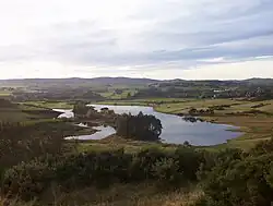 A number of significant bodies of water exist close to the village, including the Auchendores reservoir at Cloak (to the north of the village) and the Knapps Loch, part of the Duchal estate.[51][52] The Knapps Loch and the area around it is used for recreational activities and events in the village. The Loch is itself artificial, having been created by a local angling club in the early 20th century. It is shallow, with a number of islands, and has a small boathouse and landing stage at the shore.[53]