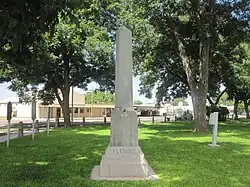 Obelisk monument to Burt M. Fleming (1894-1918), cited for bravery in World War I, is located on the lawn of the Kimble County courthouse.