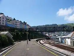 The railway originally approached the station across three creeks on low timber viaducts. Those at Longwood and Noss being demolished after the line was moved inland around the creeks on 20 May 1923, and Hoodown Viaduct, just outside the station, was replaced by a double-track steel structure in 1928. This and the provision of a larger turntable enabled larger locomotives to work through to Kingswear. The platform was extended in 1929 to 850 feet (259 m) which allowed longer trains too.