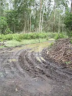 Tracks of logging trucks on Munnar Road near Palavachar Stream