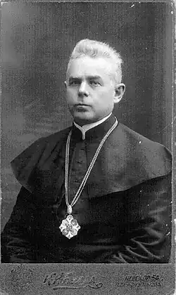 Lithuanians long wanted to replace Kazimierz Mikołaj Michalkiewicz, administrator of the Diocese of Vilnius, with a more pro-Lithuanian candidate. An opportunity arose while conducting negotiations with Germany. Olšauskas was recommended to Pope Benedict XV by German Chancellor Georg von Hertling and diplomat Matthias Erzberger in fall 1917.[80] He was also supported by the Council of Lithuania,[81] and Juozas Purickis collected 200 signatures of priests in his support.[82] According to Vladas Mironas, Olšauskas even harbored a scheme to invite Spanish prince Alfonso as King of Lithuania and with his help become the bishop.[83] In June 1918, Michalkiewicz led a procession during the Corpus Christi celebration that had banners with Polish slogans such as "God Save Poland" and "Almighty, Return Freedom to Our Homeland". Thus, a religious procession became a political demonstration.[84] The incident was used by the Germans as a pretext to expel Michalkiewicz from Vilnius to the Maria Laach Abbey in Rhineland-Palatinate on 19 June[85] and to force the pope to make changes in the diocese.[86] However, Olšauskas due to his pro-German and anti-Polish attitudes was not an acceptable candidate to the Holy See. The pope appointed Jurgis Matulaitis-Matulevičius as the new bishop in October 1918.[87]