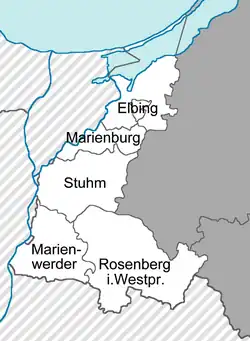 After the First Partition of Poland in 1772, the area of the future Rosenberg district was assigned to the newly created province of West Prussia as part of the Marienwerder district. As part of a comprehensive district reform in Regierungsbezirk Marienwerder, the new Rosenberg district with the capital at Rosenberg in Westpreußen was formed on 1 April 1818 from the eastern part of the Marienwerder district. The district included Bischofswerder, Deutsch Eylau, Freystadt, Riesenburg and Rosenberg.[1]